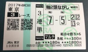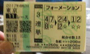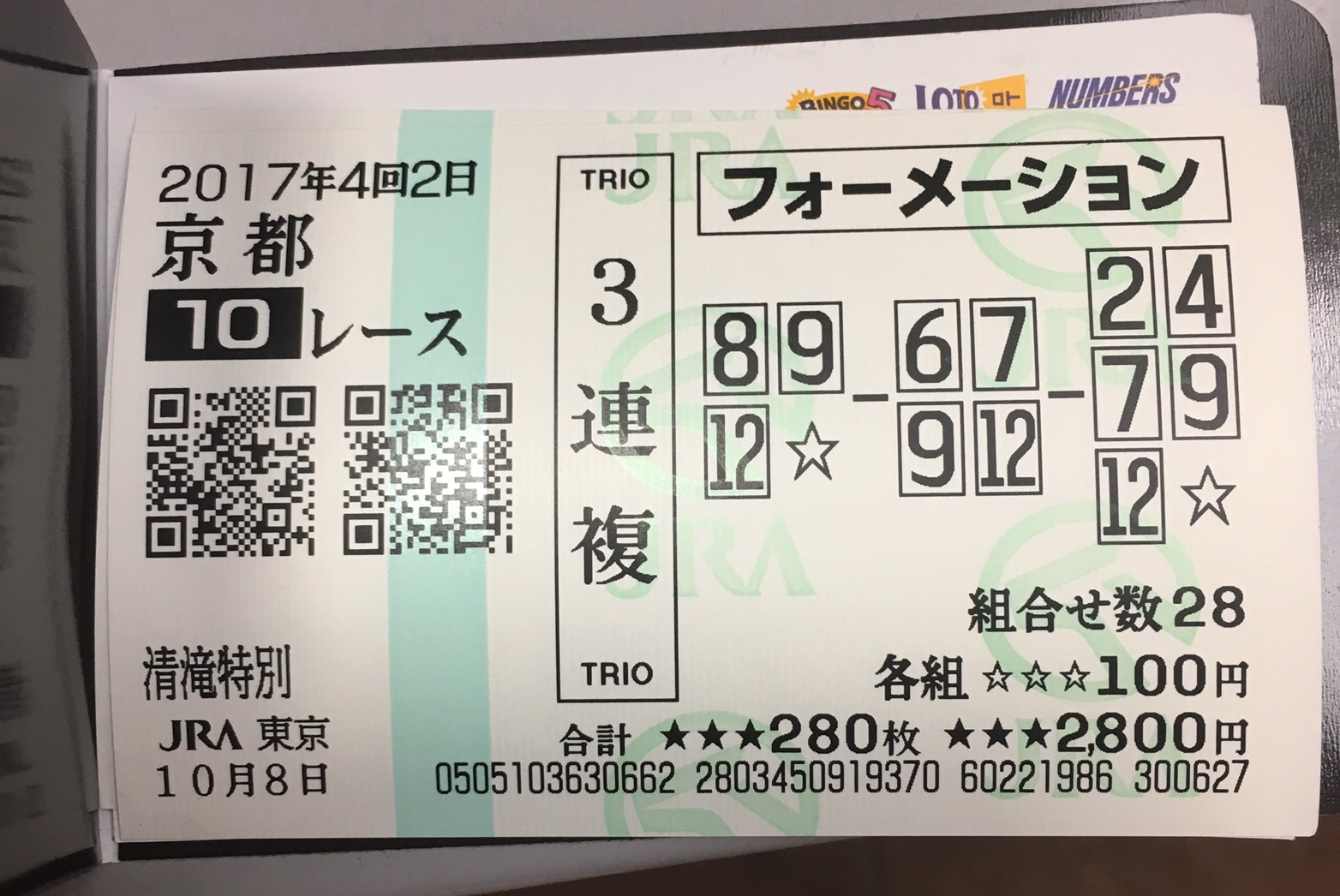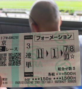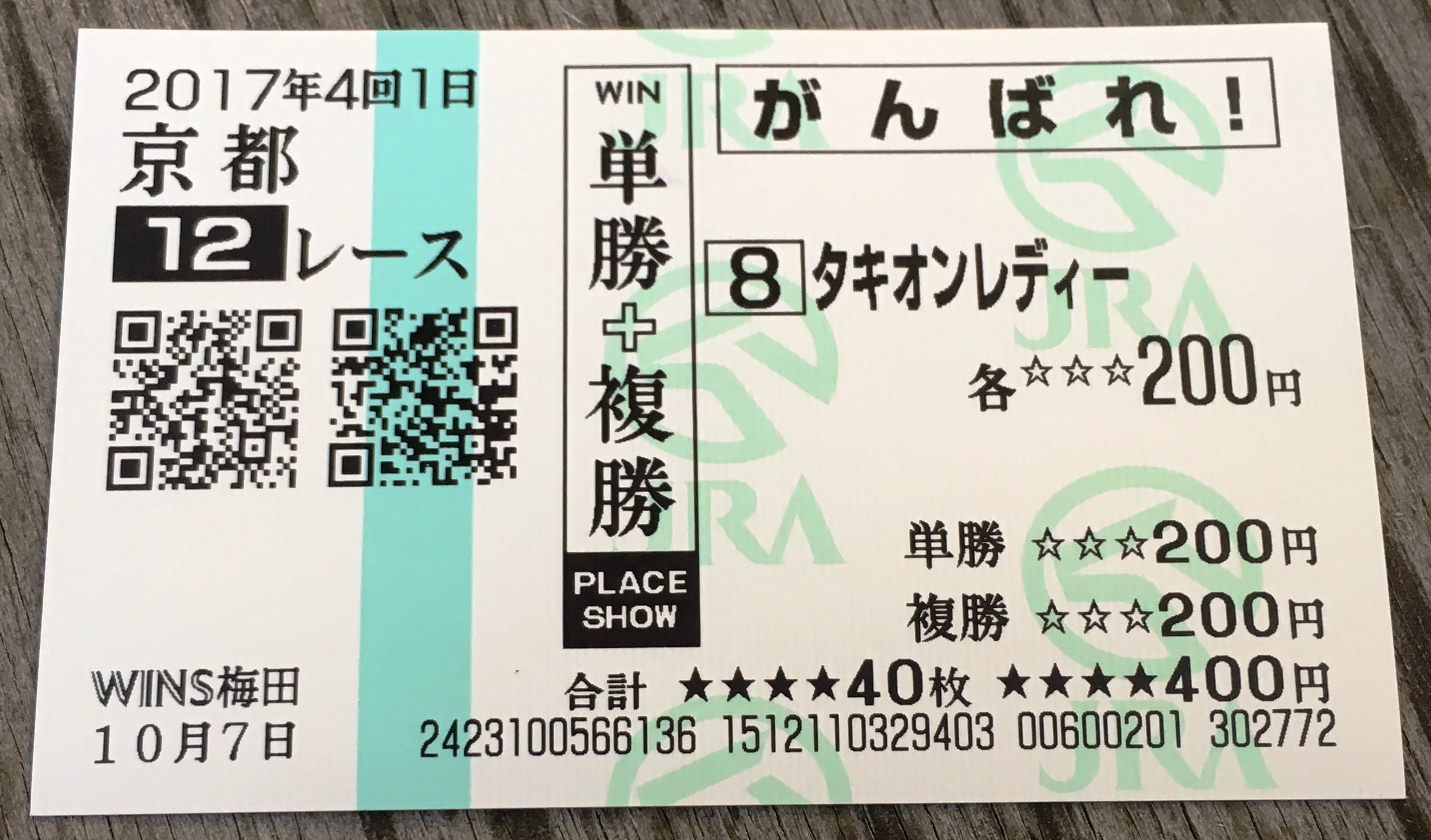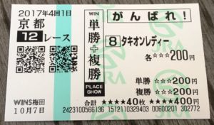 京都最終では、今回くらいは走ってくれるだろう「タキオンレディ」の応援馬券は梅田で買っていたので、ワイドで購入しました。第4コーナーまでは先頭集団にいたのでそのまま~とさけんだのですが、13着となりました。東京12Rは1着に10番サンティルを入れなかったため逃してしまいました。